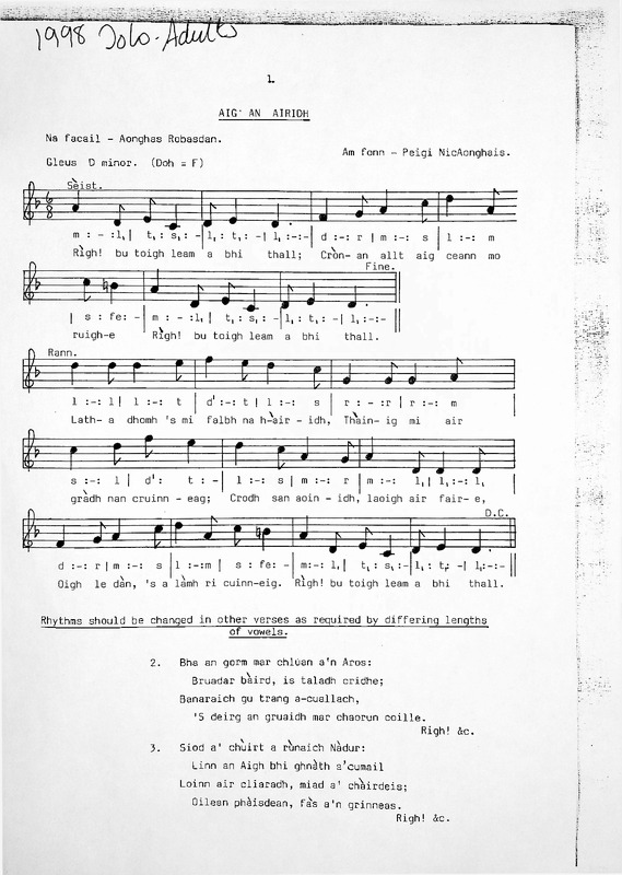 - Na facail le Aonghas Robasdan, am fonn le Peigi NicAonghais. Words by Angus Robertson, melody by Peigi MacInnes.